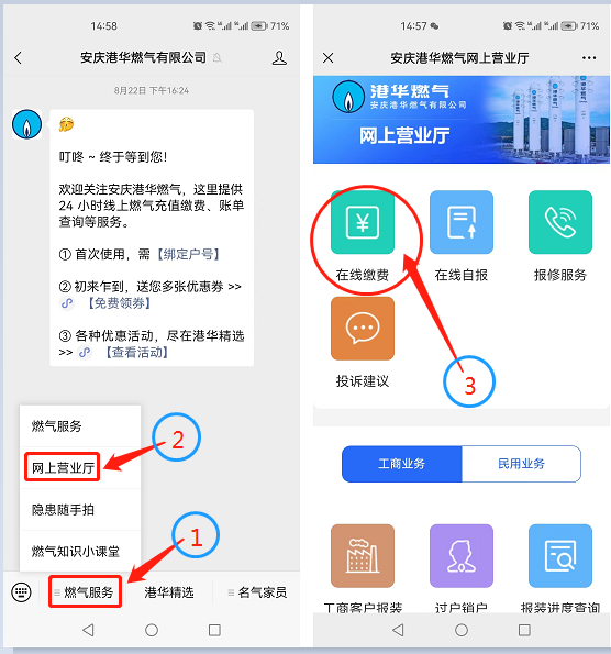 微信公眾號:關(guān)注我公司微信公眾號“安慶港華燃氣有限公司”,點擊“燃氣服務(wù)”-“網(wǎng)上營業(yè)廳”,在網(wǎng)上營業(yè)廳中選擇“在線繳費”,即可繳納燃氣費或者預存氣費。