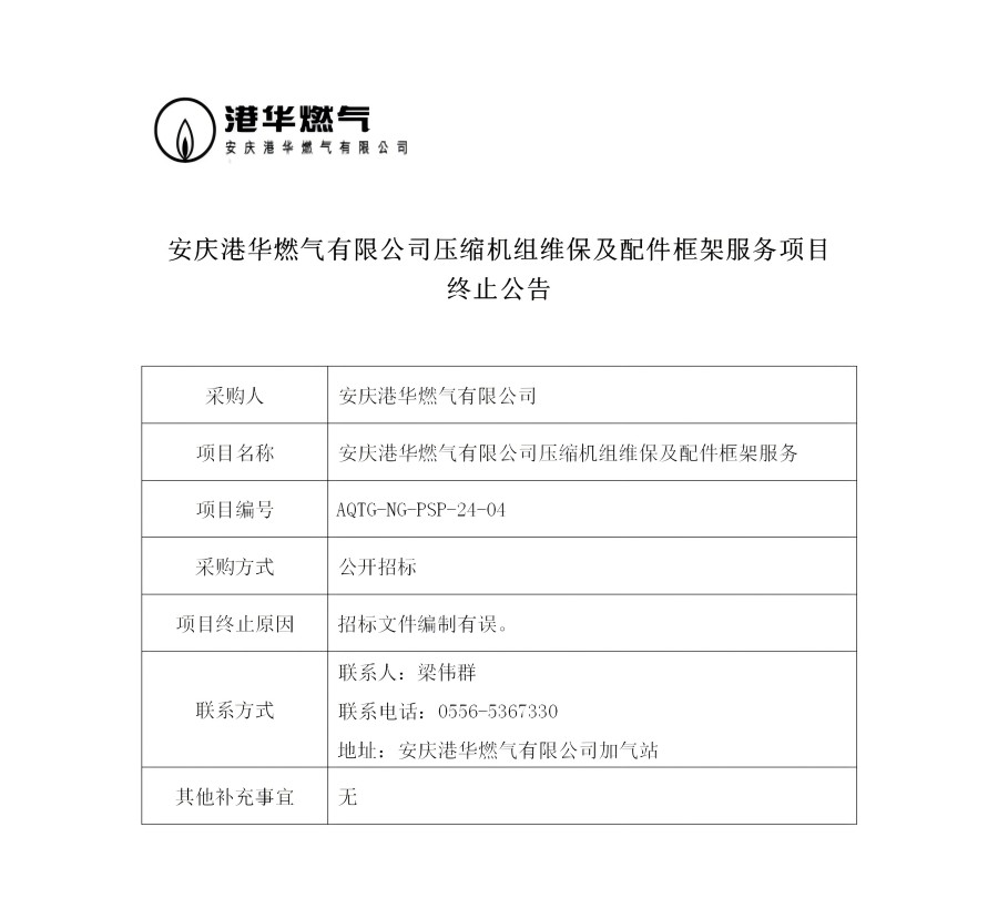 安慶港華燃?xì)庥邢薰緣嚎s機組維保及配件框架服務(wù)項目終止公告