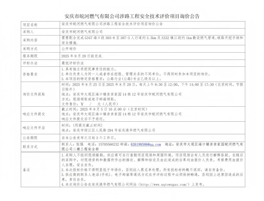 安慶市皖河燃?xì)庥邢薰旧媛饭こ贪踩夹g(shù)評(píng)價(jià)項(xiàng)目詢價(jià)公告