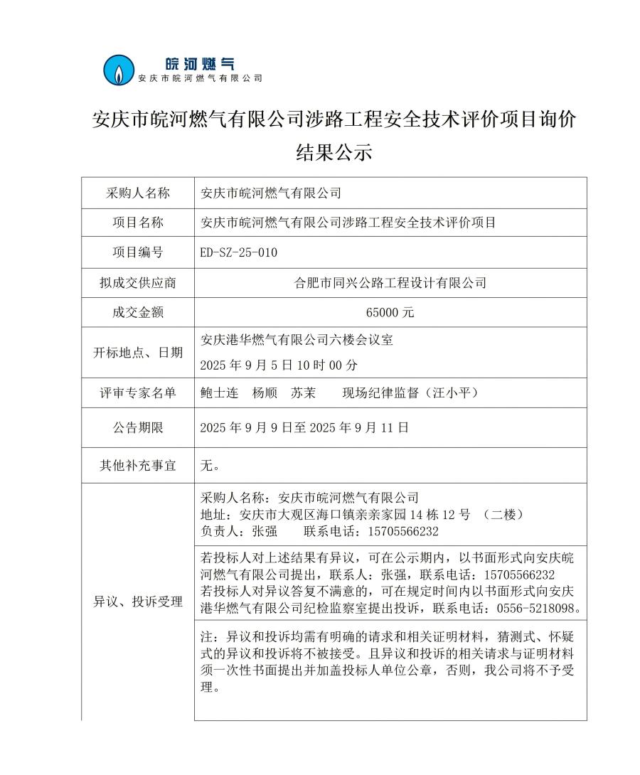 安慶市皖河燃?xì)庥邢薰旧媛饭こ贪踩夹g(shù)評(píng)價(jià)項(xiàng)目詢價(jià)結(jié)果公示